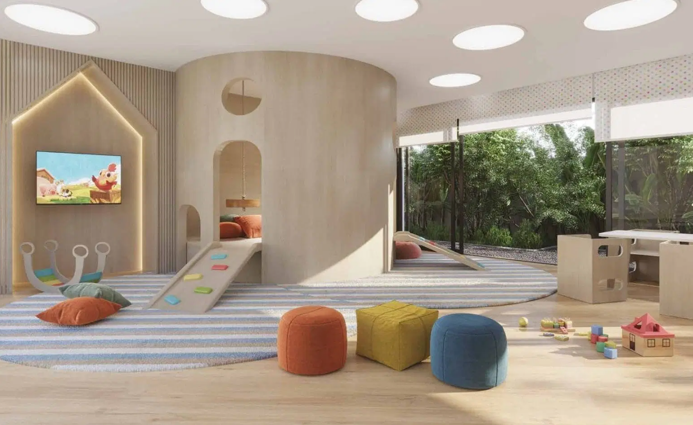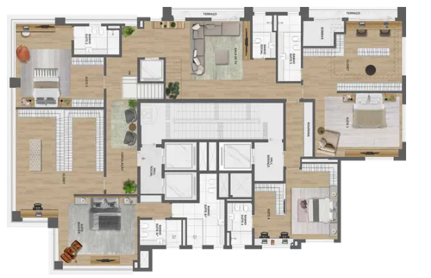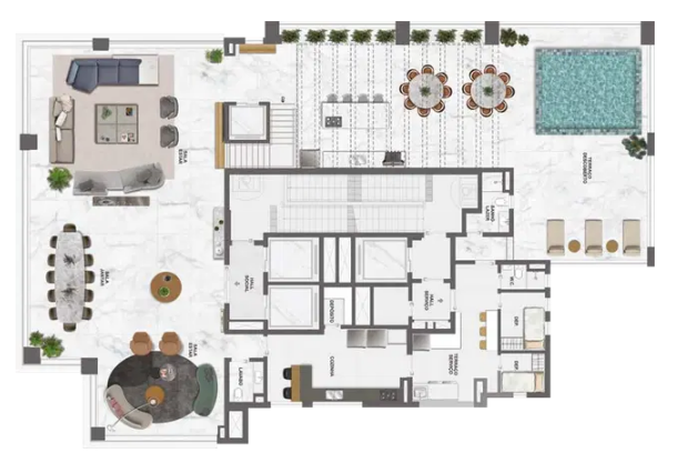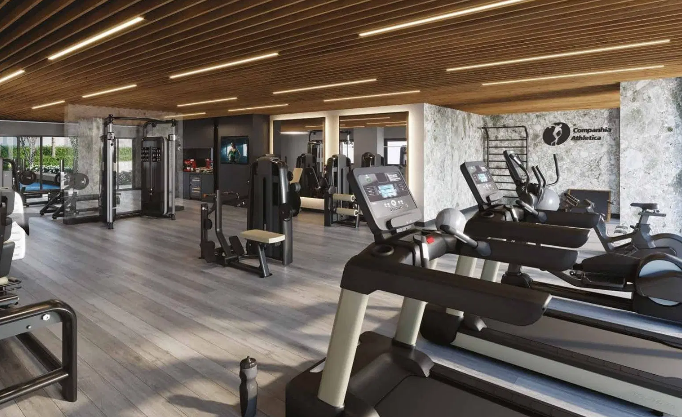 As opções de tipologia incluem apartamentos de 375 m² com quatro suítes e cinco vagas de garagem, gardens com terraço descoberto de mais de 170 m², e coberturas duplex de 688 m² com piscina privativa, terraço panorâmico e elevador interno. O condomínio oferece infraestrutura completa de lazer e bem-estar, com piscina, academia assinada pela Cia Athletica, spa, sauna, salão de festas, churrasqueira, playground e brinquedoteca, além de portaria 24 horas e acessibilidade garantida.